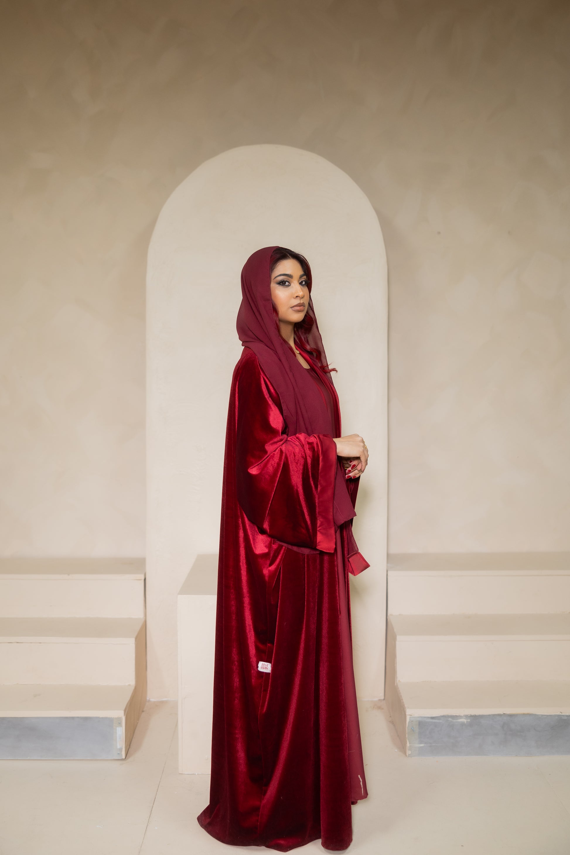 - A luxury velvet abaya in a deep red tone, with a soft, fluid drape that falls effortlessly on the body