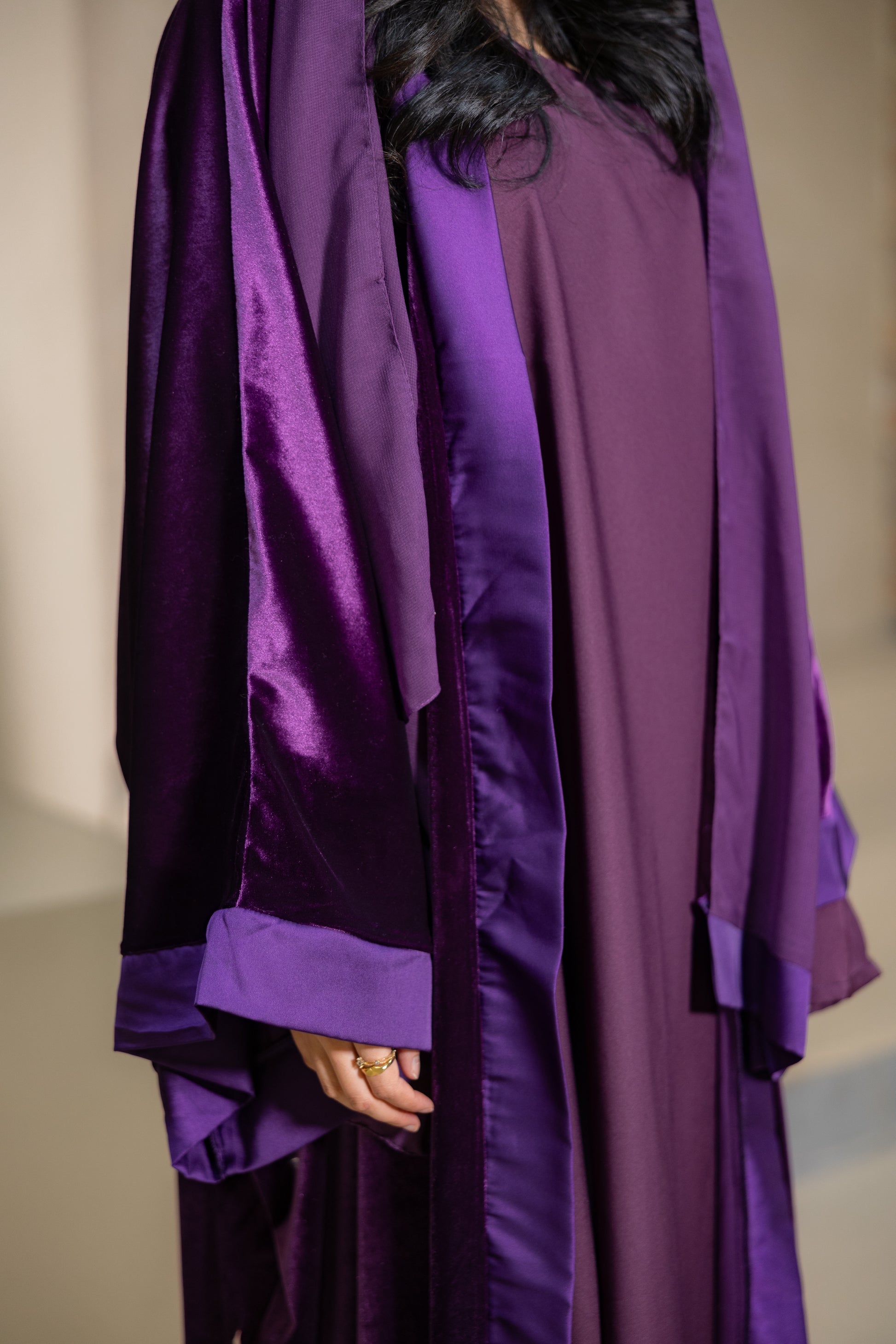 - A luxury velvet abaya in a deep purple tone, with a soft, fluid drape that falls effortlessly on the body