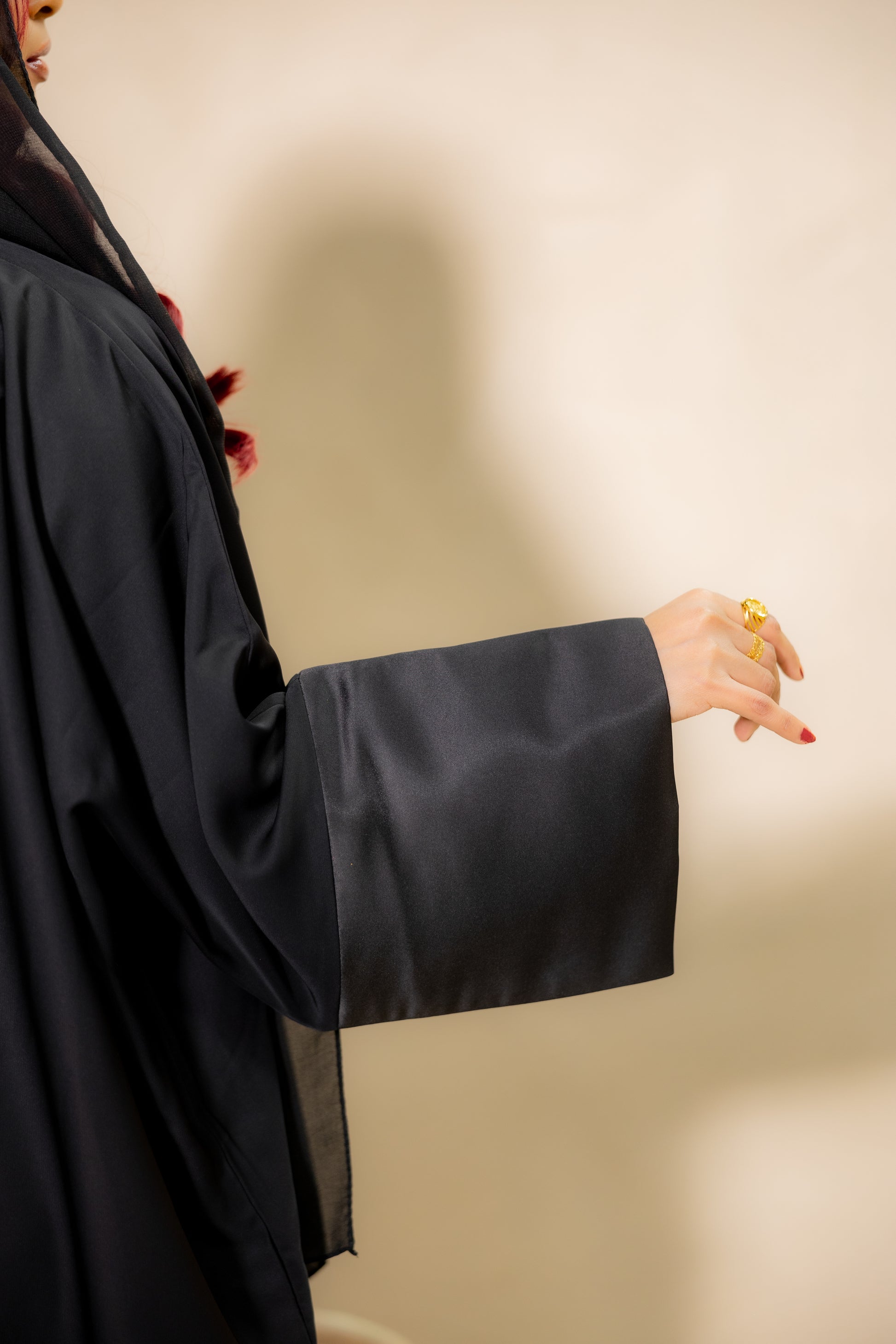 - A luxury black abaya crafted in premium Nada fabric, known for its smooth texture, elegant fall, and fluid drape